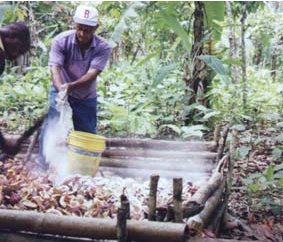 Generalmente los frutos se desgranan en el campo dejando las cáscaras tiradas en el suelo, lo cual se debe evitar por constituir un material en descomposición que sirve de fuente de inoculo de patógenos naturales del cacao (plagas y enfermedades). Se recomienda quemar o enterrar los frutos enfermos, evitando así la infestación de los frutos sanos. Si se fermentan las almendras atacadas por patógenos u otros microorganismos, éstas se deben colocar en un montón o cajón aparte de las almendras sanas y normales, así evitaríamos una mala fermentación en la masa del cacao. Además, los granos dañados tienen un gusto desagradable y están infestados con mohos que pueden producir micotoxinas. Te recomiendo consultar la serie de artículos acerca de las ENFERMEDADES DEL CACAO EN VENEZUELA. Los restos de cosecha deben ser dispuestos de manera adecuada, en cajones de bambú o madera en los picaderos, pudiendo utilizar los mismos para la elaboración de composteros (lee el artículo FERTILIZACIÓN NATURAL U ORGÁNICA PARA EL CULTIVO DE CACAO.); de ser posible a estos restos se le deben realizar aplicaciones de fungicida e insecticida para prevenir proliferación de agentes patógenos.