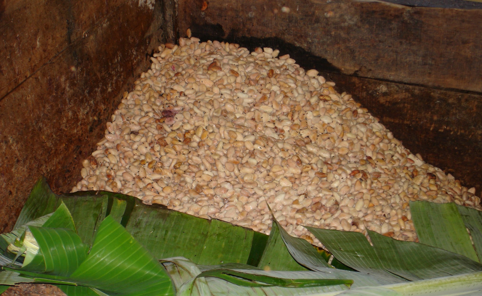 Para la fermentación se colocan las almendras frescas dentro de cajones de madera por un período de 3 a 5 días, dependiendo de la variedad o tipo de Cacao. Para una buena fermentación, debe colocarse la masa de cacao en los cajones y cubrirlos con hojas de plátano, sacos de yute o plástico, para conservar el calor desprendido por la fermentación alcohólica. Se deben realizar volteos de la masa de cacao para uniformizar el desarrollo de los procesos bioquímicos.