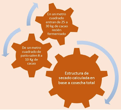 En todos estos casos se debe calcular el área necesaria para colocar el cacao que sale de los cajones de fermentación tomando en cuenta la cantidad de cacao producido en el año, que en un m2 de piso de secado entran de 25 a 30 Kg de cacao recién fermentado y salen de ocho a diez Kg de cacao seco.