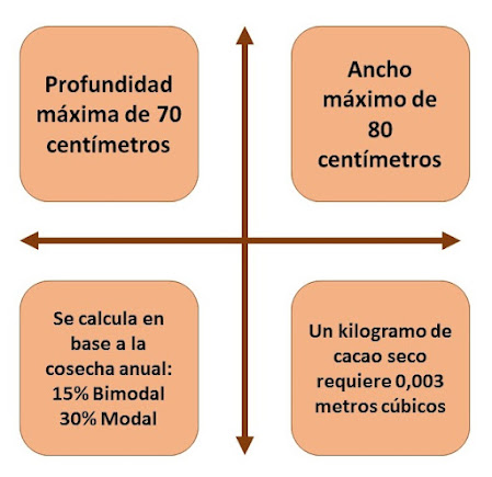 En general las cajas se hacen de 1 m3, que se llenan hasta los 80-90 cm de altura, dando una capacidad de 800-850 Kg de cacao fresco. Las tablas deben ser lo suficientemente gruesas (3 a 4 cm) para que exista un buen aislamiento con el exterior, deben quedar bien ajustadas entre sí, colocándose a mano para retirarlas fácilmente al momento de remover el cacao.